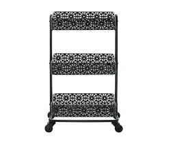 - Bottom shelf features chrome ring wine bottle holder for convenience