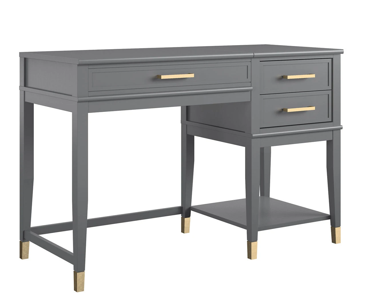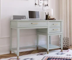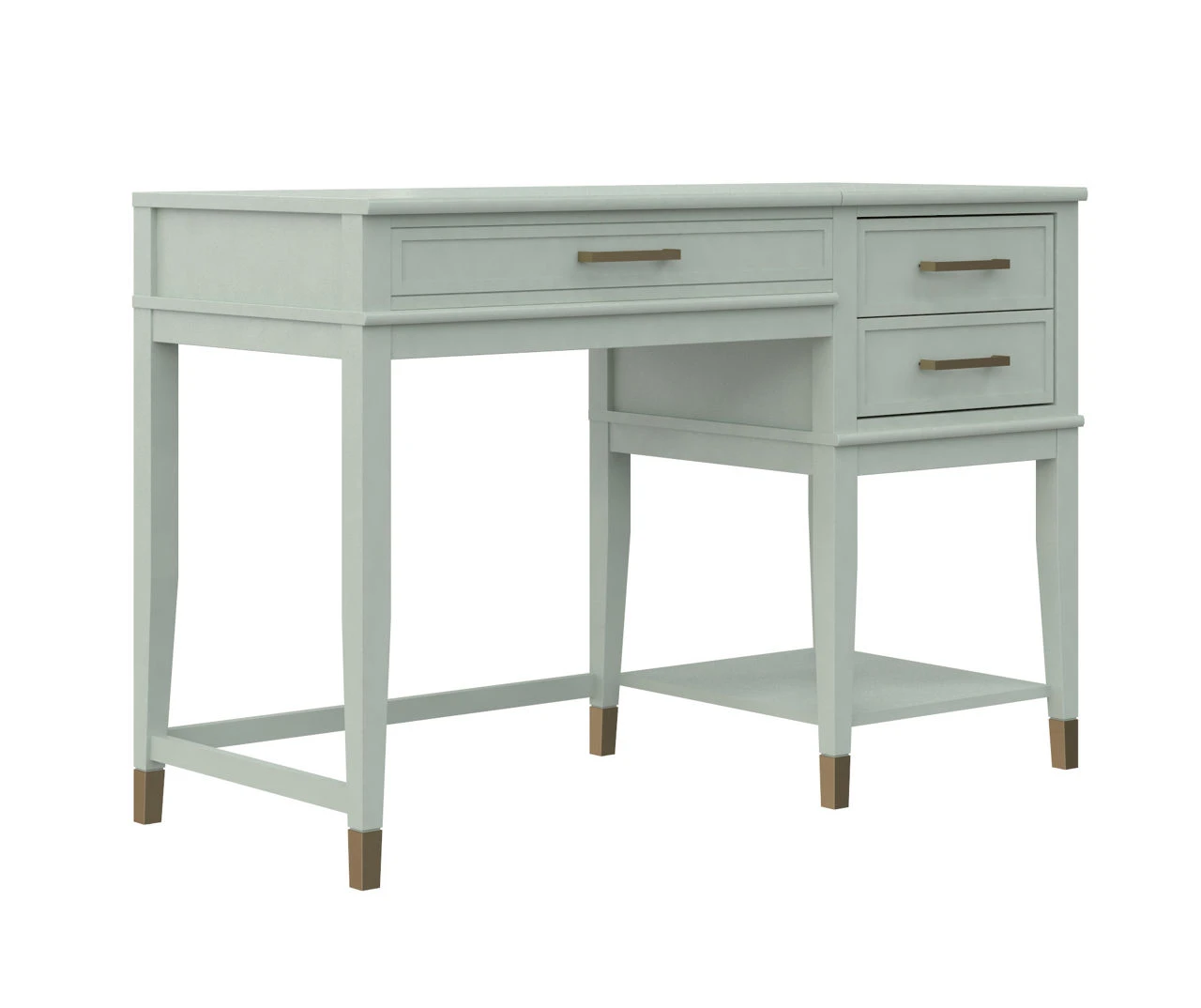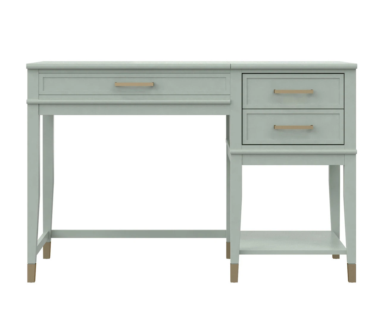 - Gold drawer hardware paired with painted feet gives the desk a chic and modern look