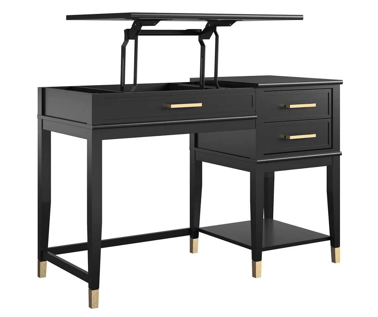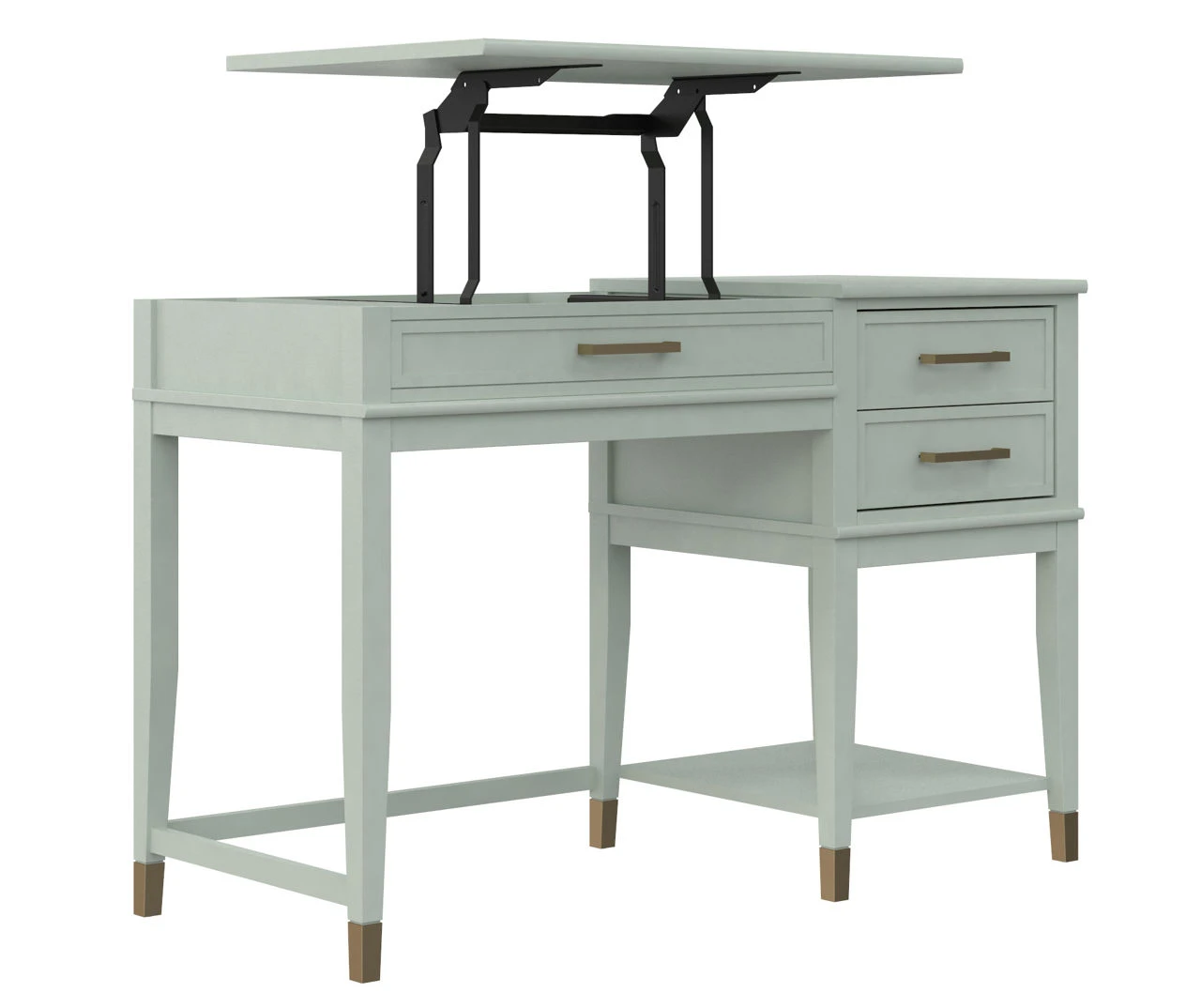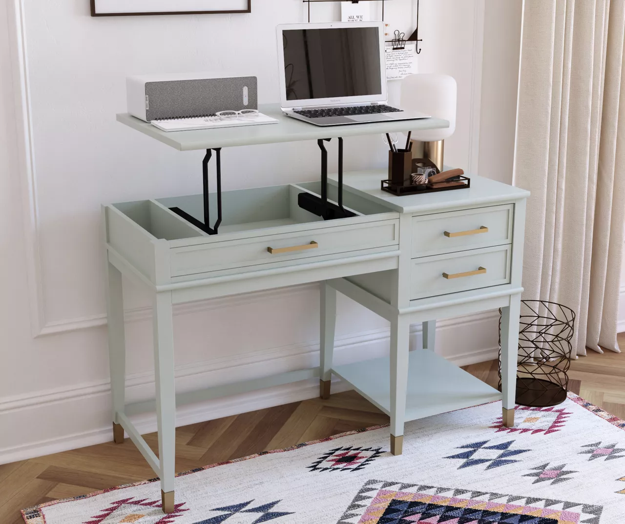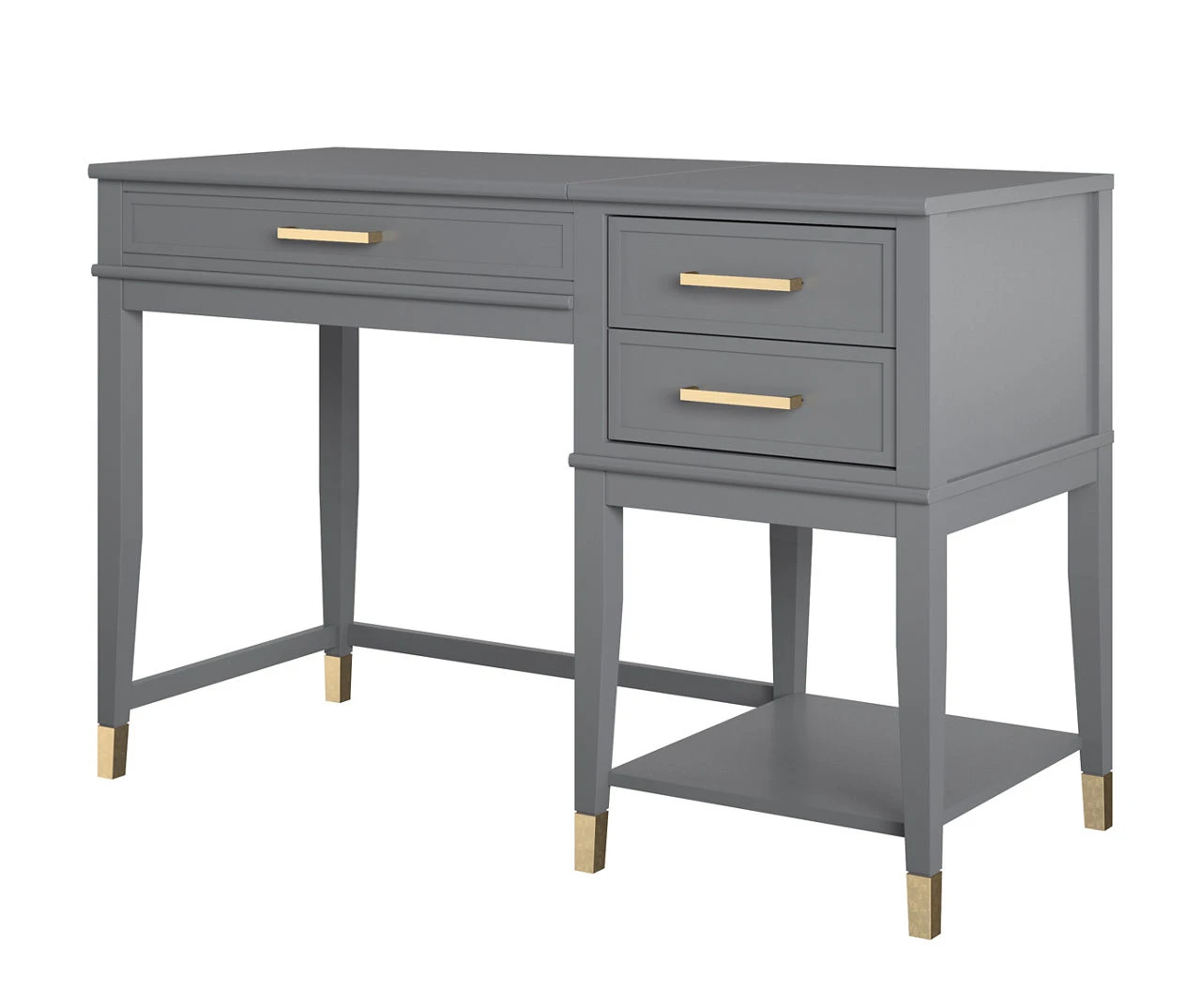 - Gold drawer hardware paired with painted feet gives the desk a chic and modern look