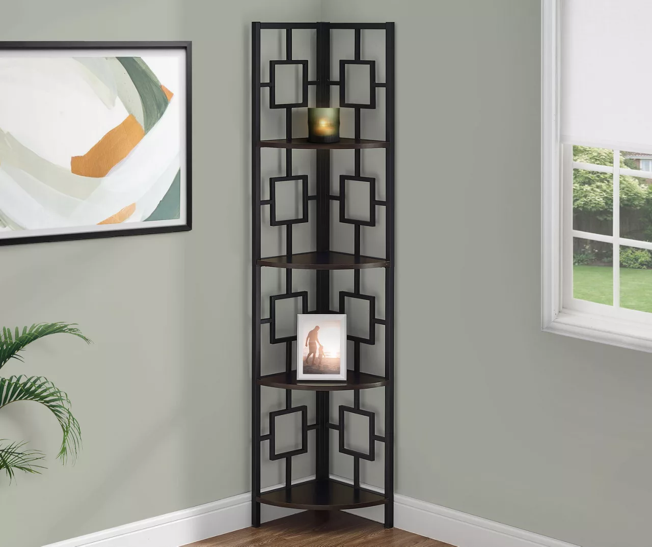 - Optimize your living or office space with the Espresso Square 4-Shelf Corner Bookcase. Its corner design fits perfectly in tight spaces while providing ample storage.