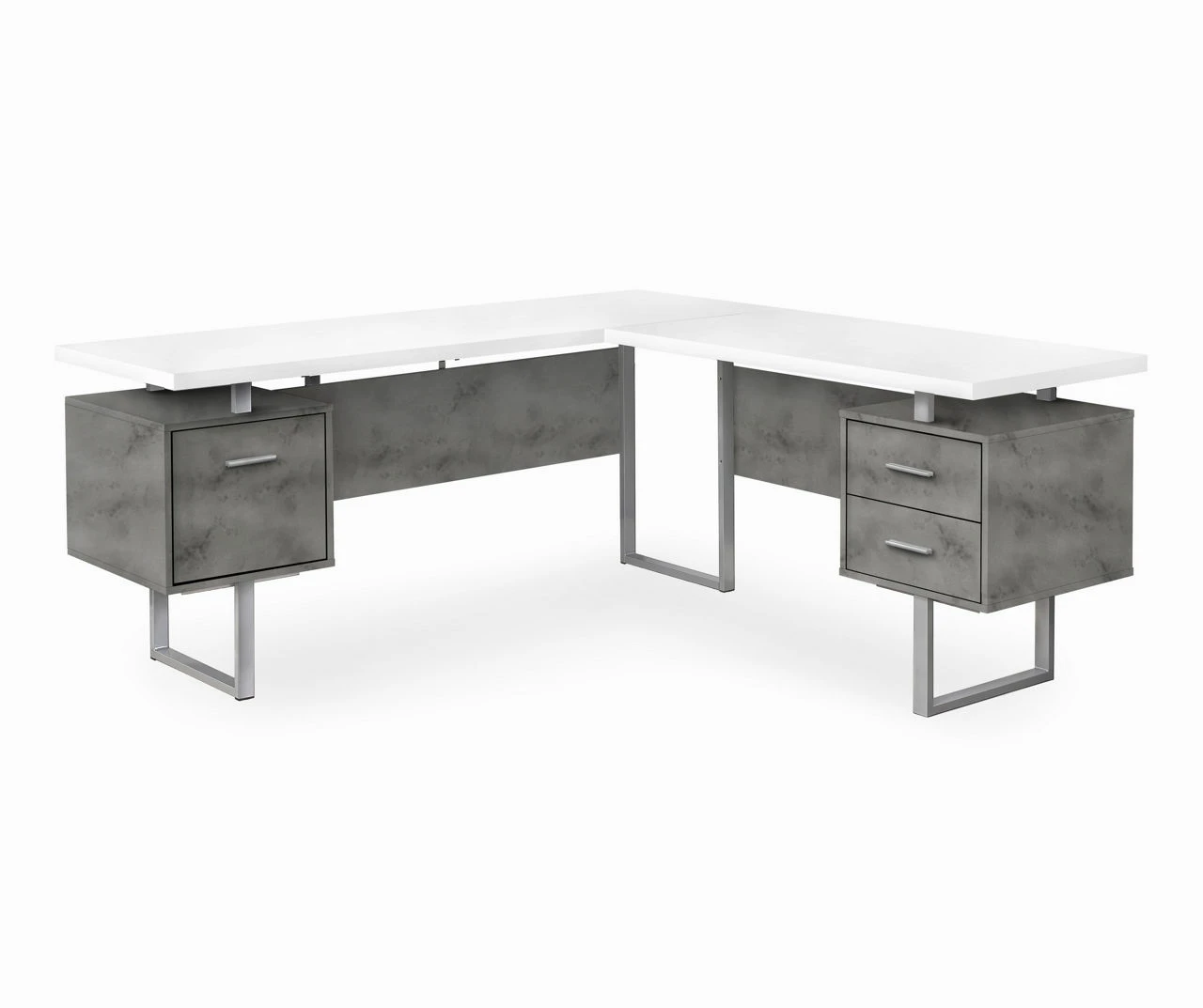 - Corner computer desk with 3 storage drawers in a grey concrete-look finish