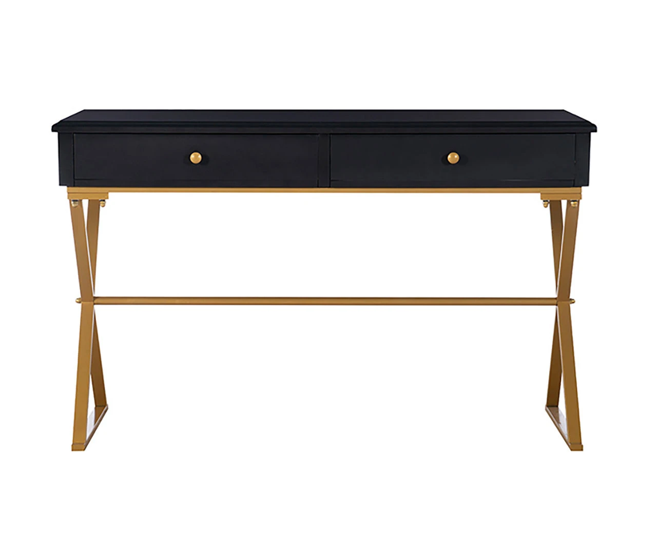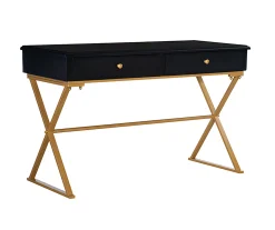 - Elevate your office space with the Glam Black & Gold 2-Drawer Campaign Desk, combining elegance and functionality in one stunning piece. Perfect for modern workspaces.