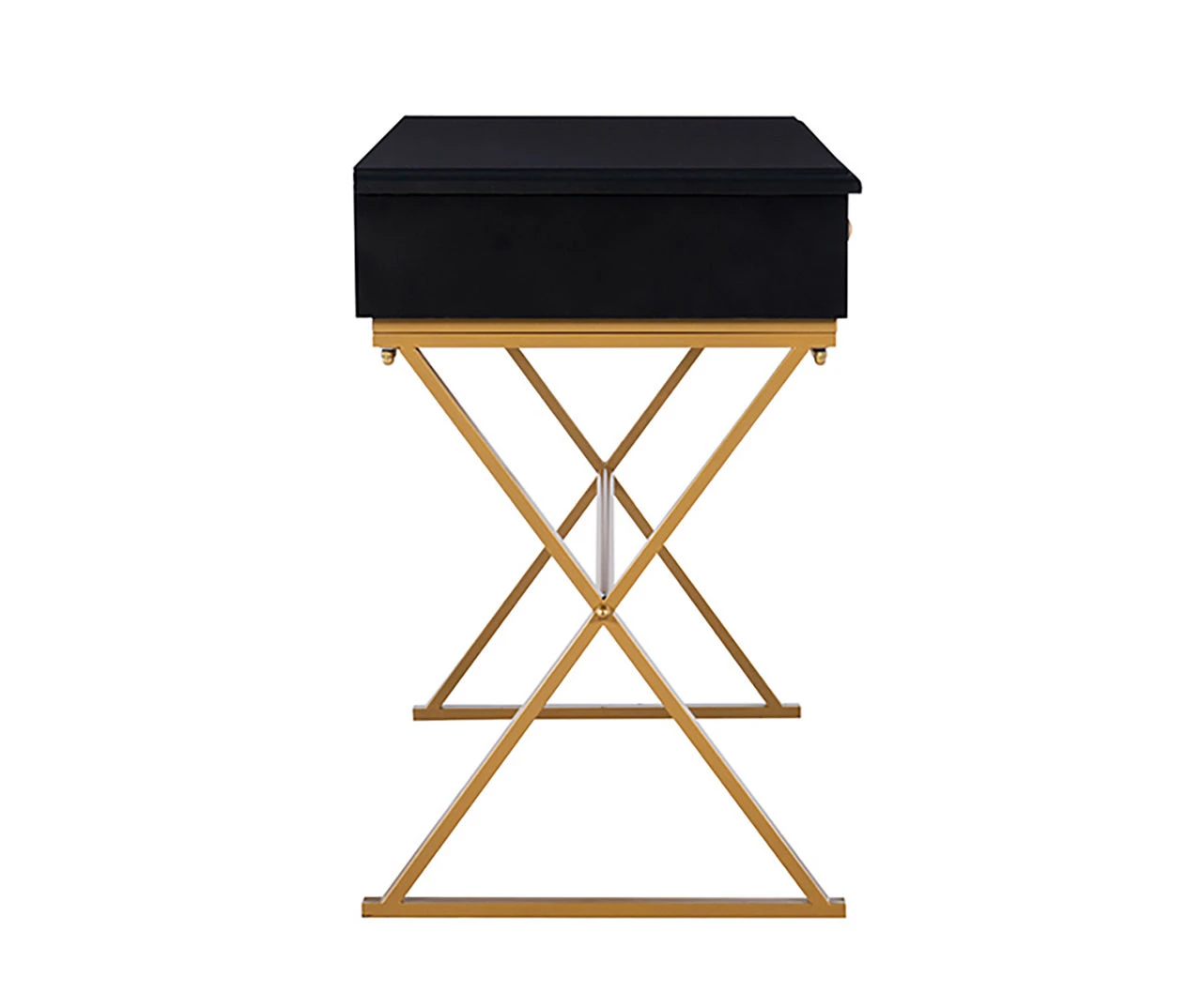 - Featuring a sleek black finish with gold accents, this 2-drawer desk offers ample storage space while maintaining a stylish and sophisticated look.