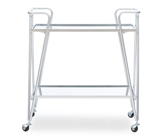 - Featuring two spacious shelves, this rolling bar cart provides ample storage for drinks, books, decor, or essentials. Its sturdy steel construction ensures long-lasting durability.