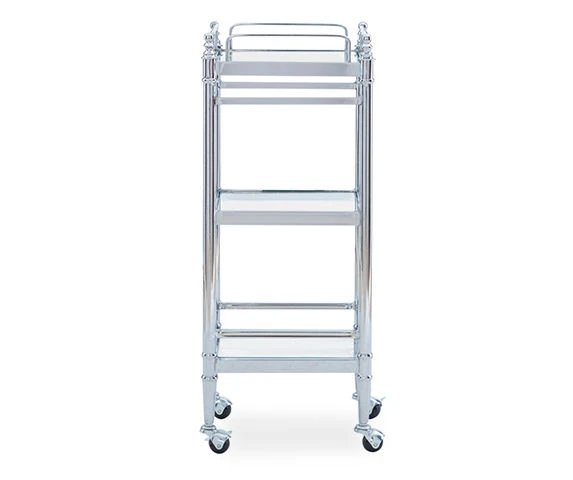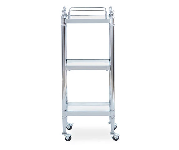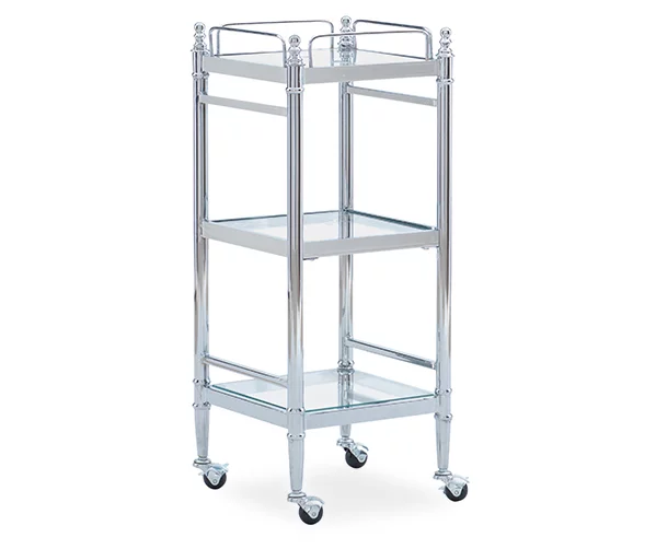 - Crafted with a sleek chrome frame and tempered glass shelves, the Hawkins 3-Shelf Rolling Cart combines durability with modern design.
