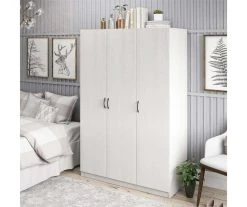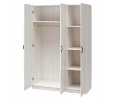 - Left-side doors open to reveal a hanging rod and an extra shelf