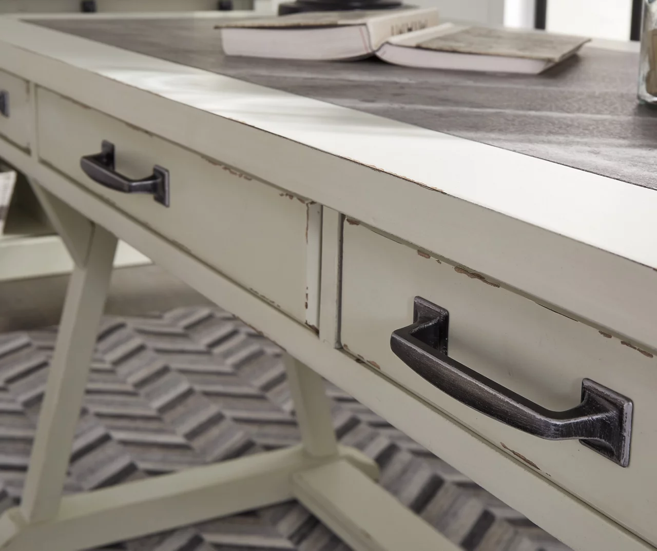 - The Jonileene White-Gray Desk combines modern design with functionality, offering a sleek and stylish addition to your office or home workspace.