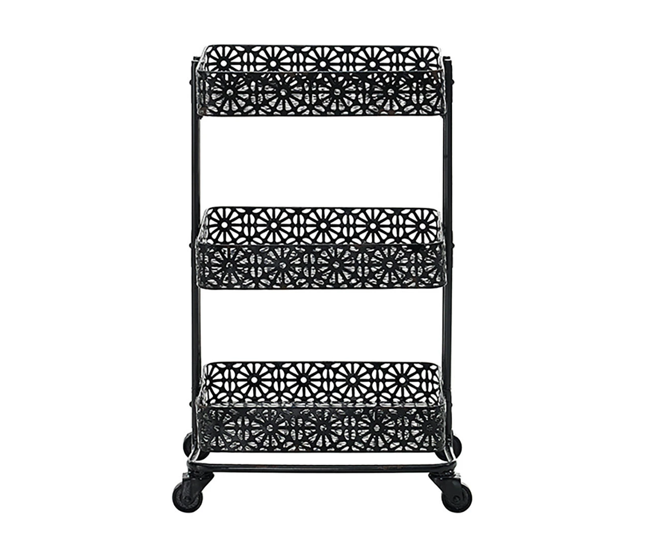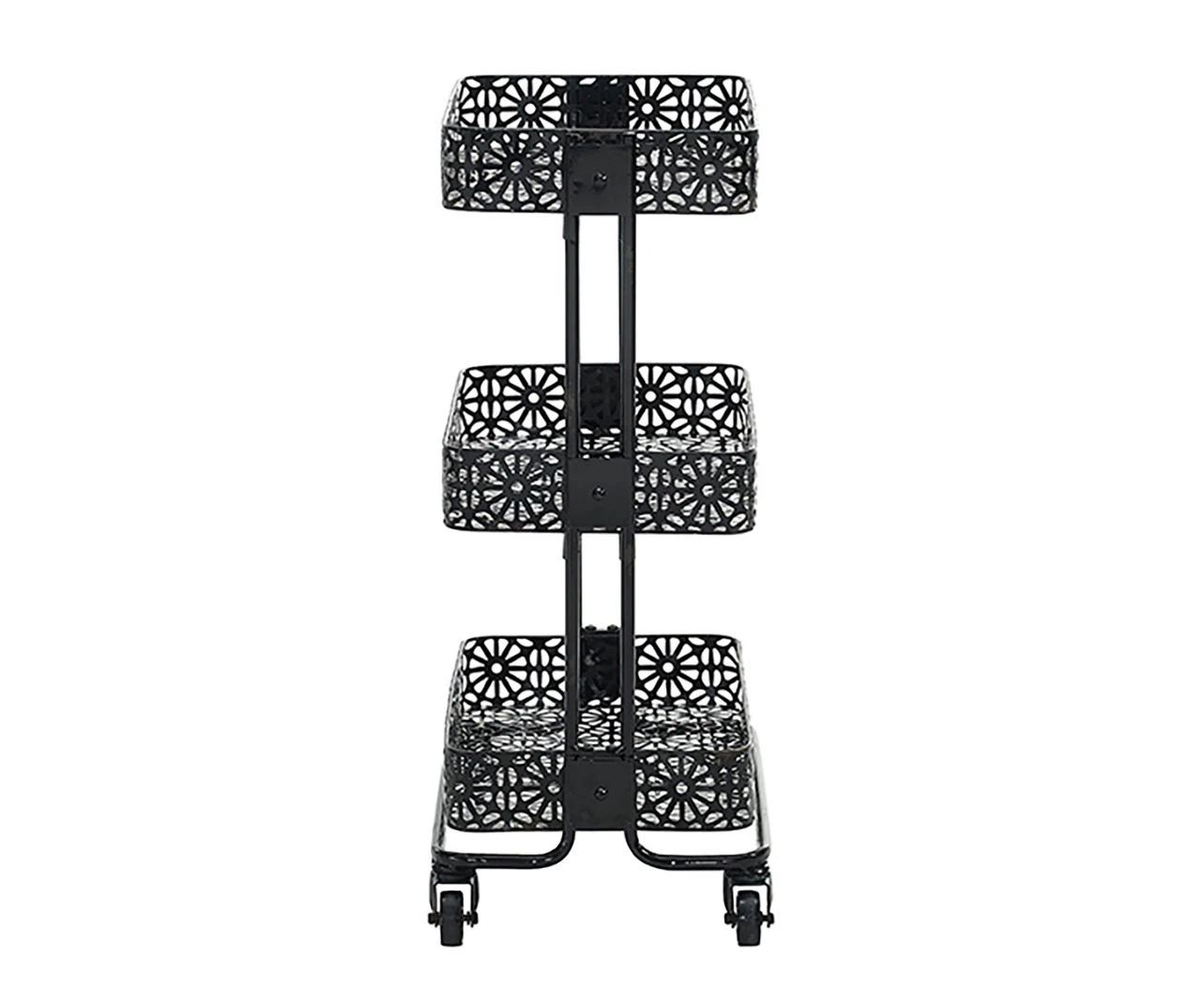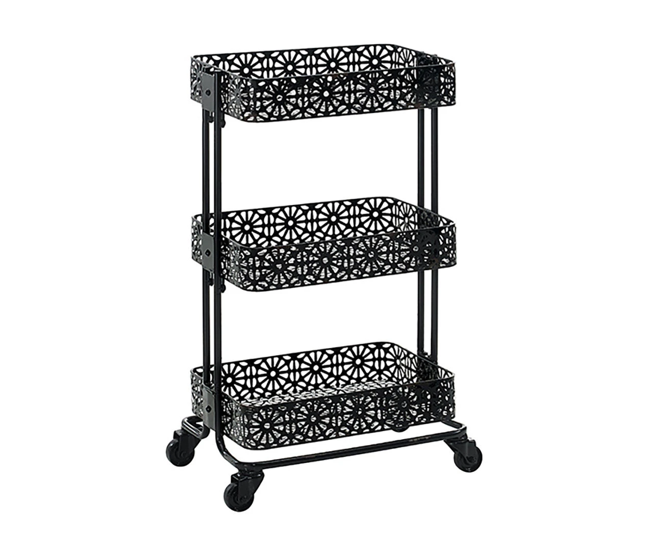 - Easy to assemble and maintain, the Mabry Black 3-Tier Pierced Floral Rolling Cart is a versatile and stylish solution for keeping your home organized and clutter-free.