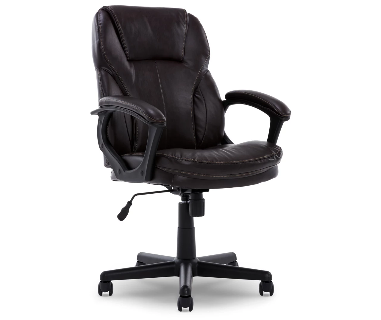 - Experience ultimate comfort with the Mitchell Roasted Chestnut Vegan Leather Office Chair, featuring ergonomic design and adjustable lumbar support for long hours of productivity.