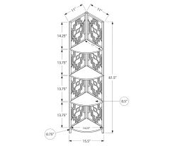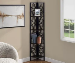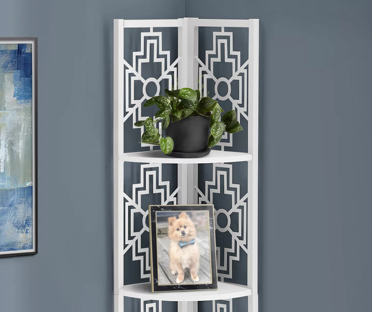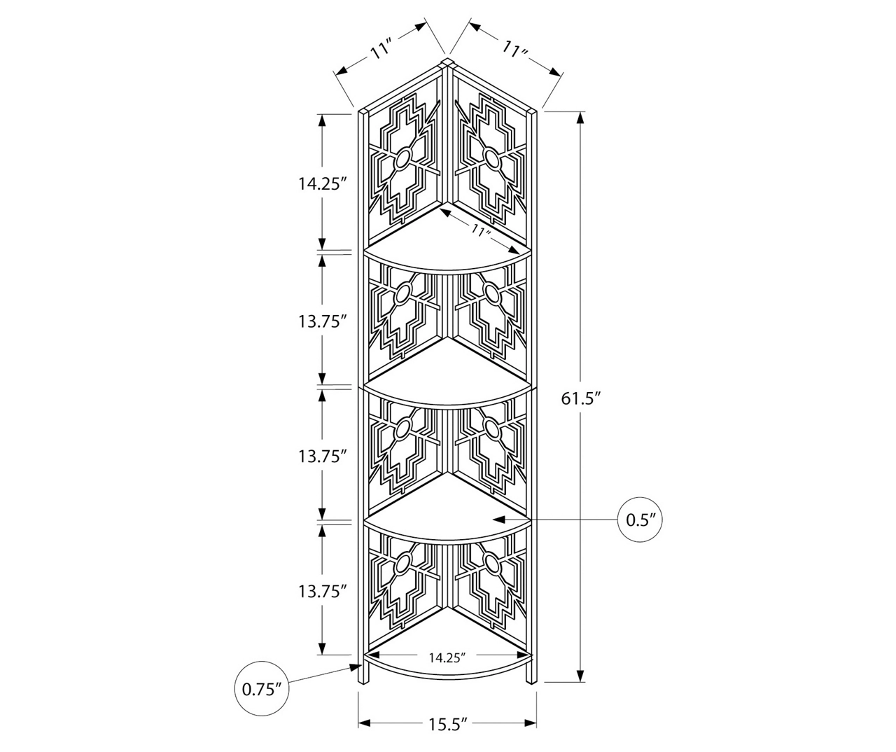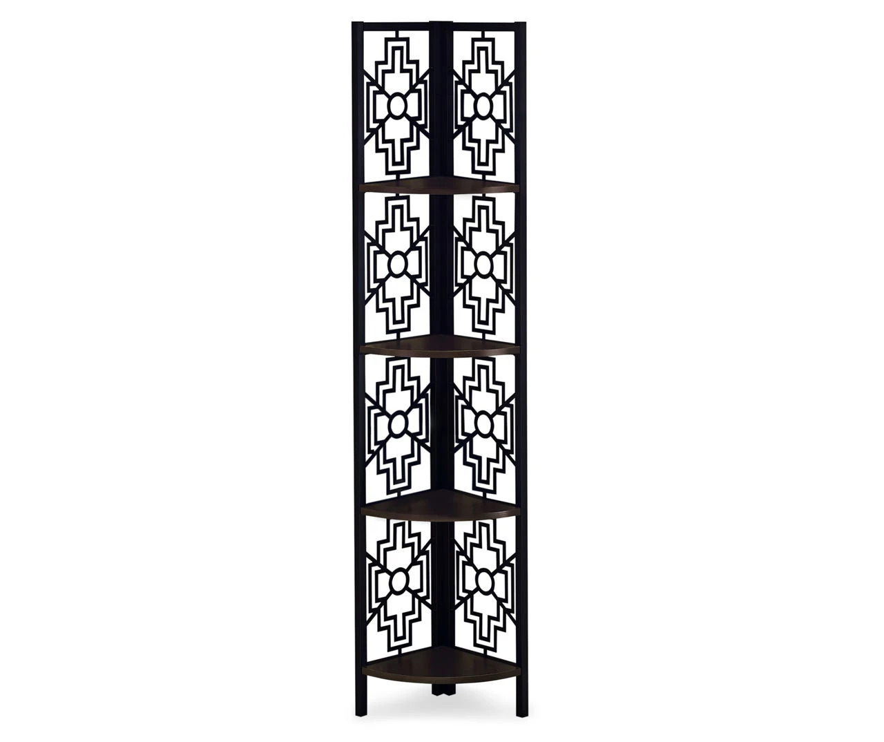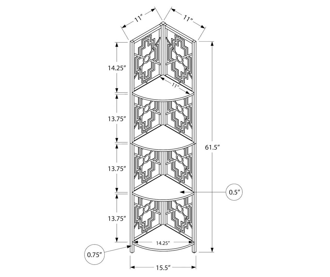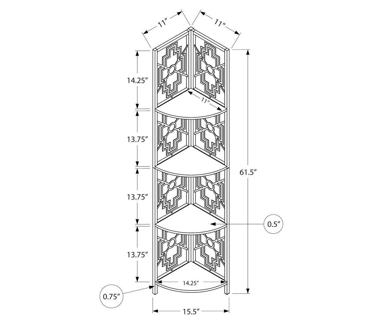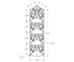 - Optimize your living or office space with the Monarch Geometric 4-Shelf Corner Bookcase. Its unique corner design maximizes storage without taking up too much room.