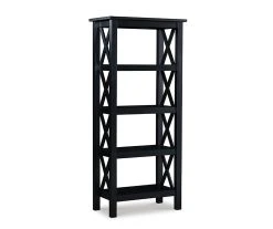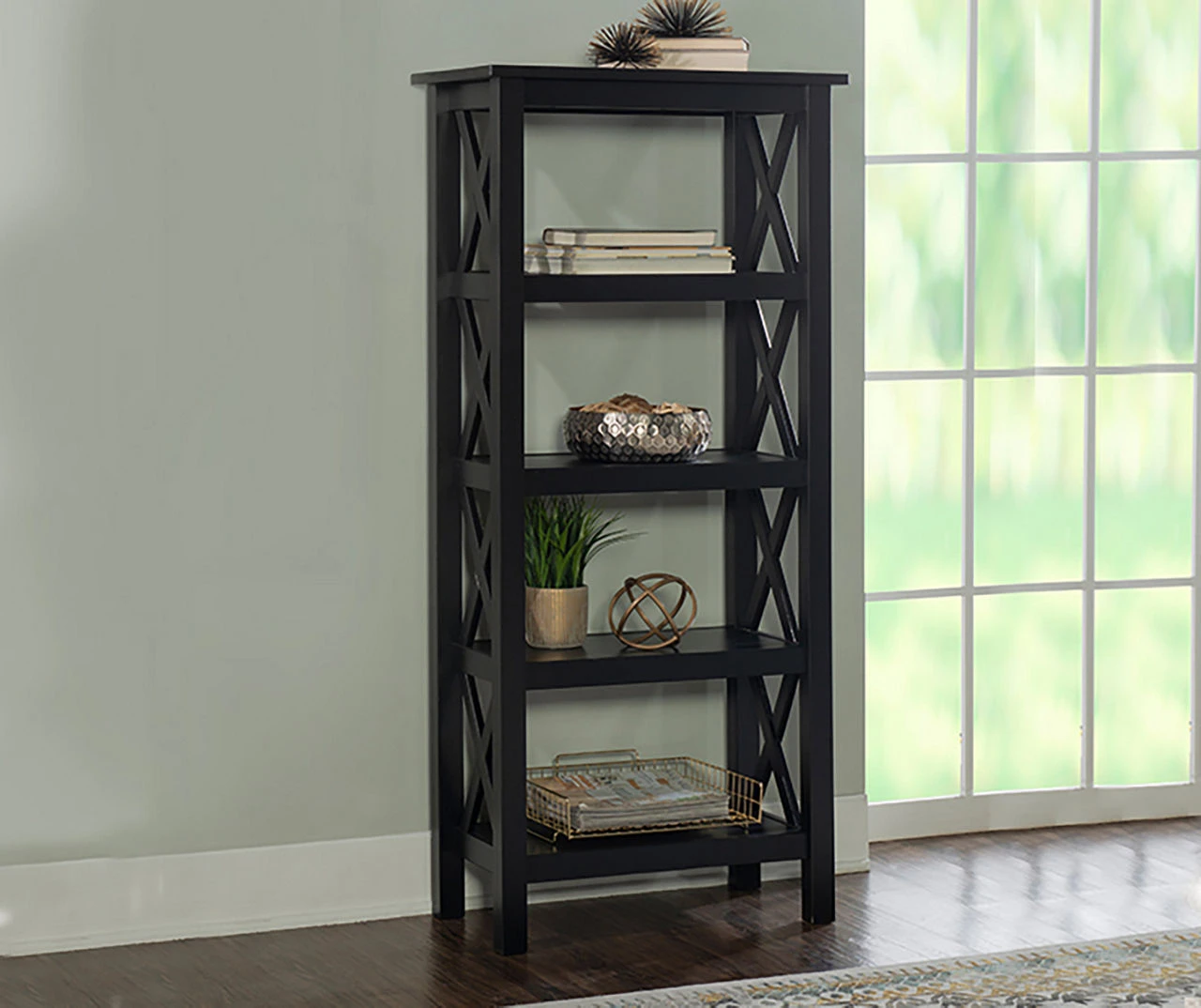 - The Richland Black 4-Shelf Bookcase is a sleek and practical addition to any room. Its modern black finish complements various decor styles, from minimalist to contemporary.