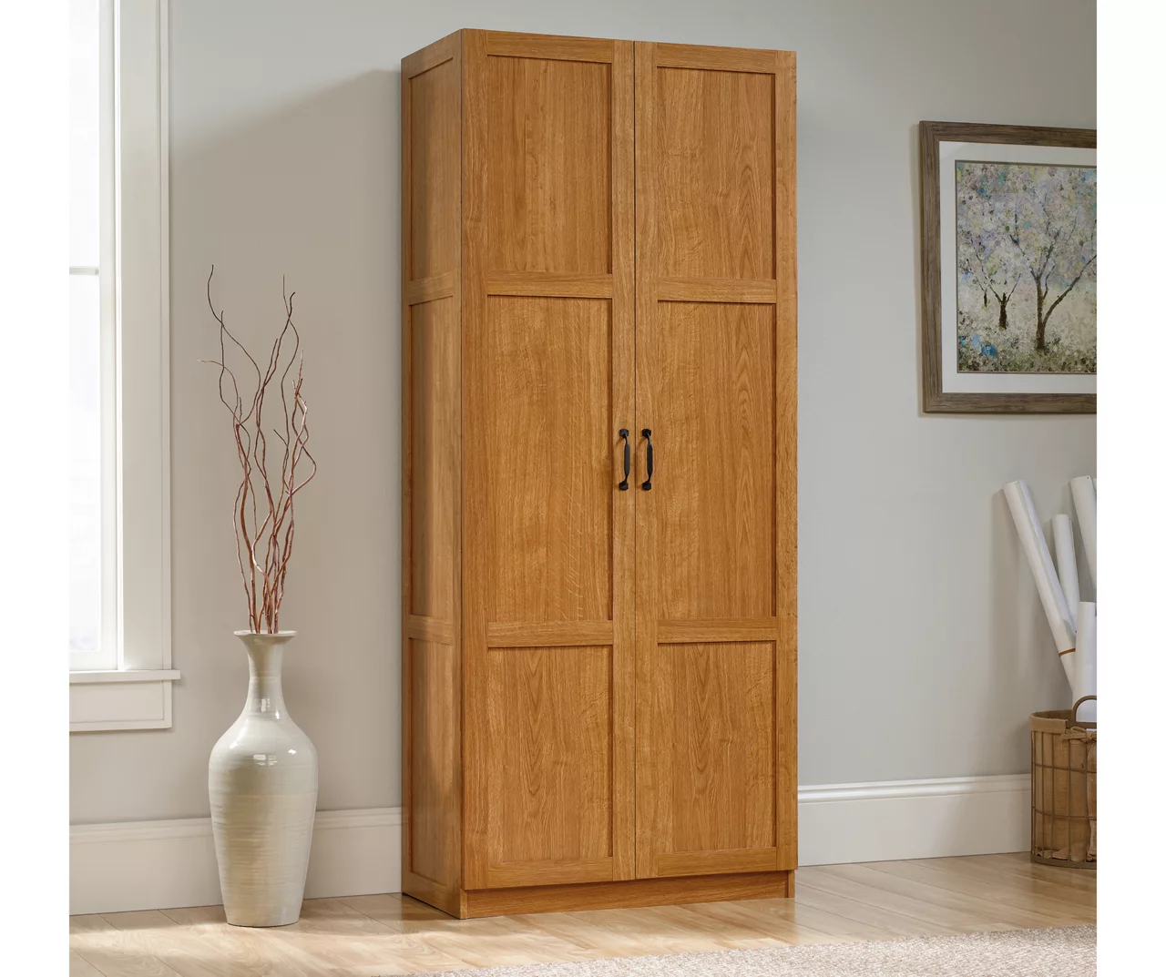 - Crafted with high-quality materials, the Sauder Storage Cabinet is both sturdy and stylish. Its neutral finish complements any decor seamlessly.