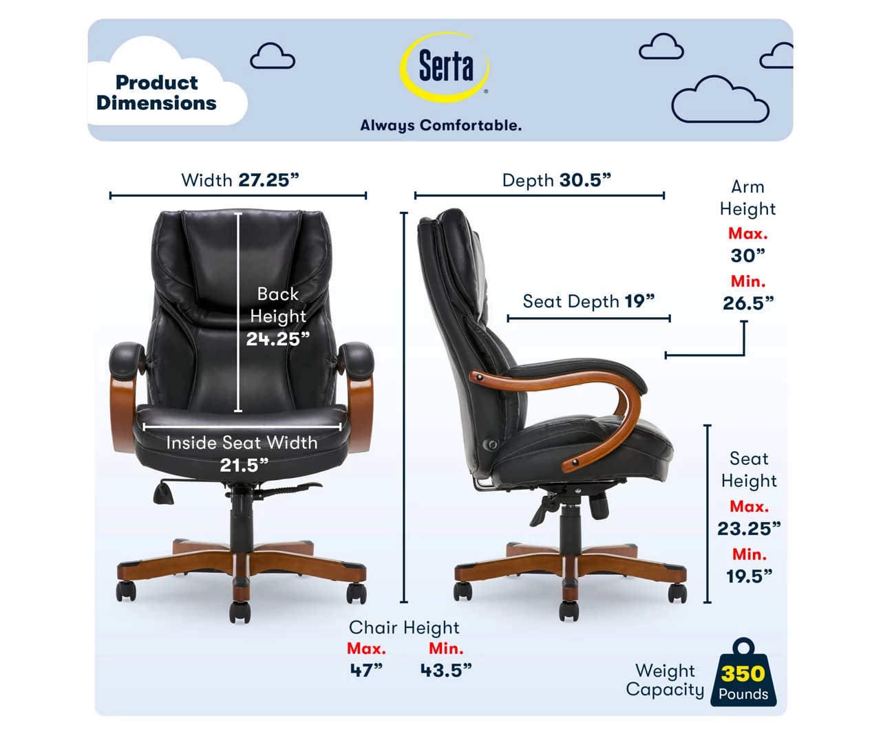 - Built to accommodate larger frames, this chair is rated for weights up to 350 lbs, making it ideal for big & tall users.