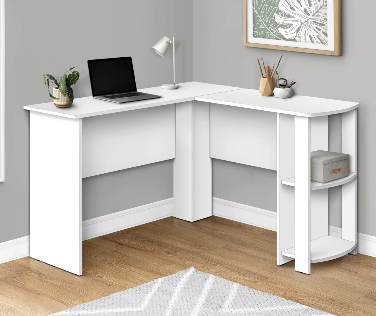 White L-Shaped Corner Desk With Open Storage | Space-Saving Office Furniture