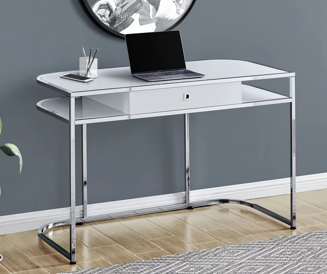 - Elevate your workspace with the sleek and modern White & Silver Chrome Office Desk. Designed for both style and functionality.